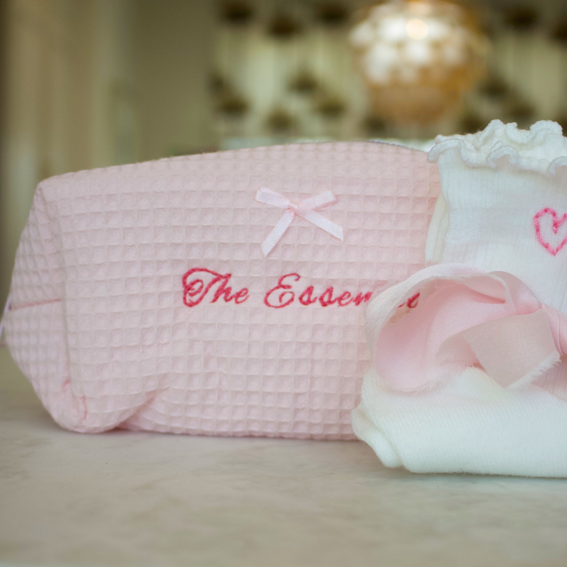 Spacious & organized, this 8.2 x 4.2 x 3.5 makeup bag (6-piece set) fits brushes, makeup, skincare, and toiletries while staying travel-friendly. Finished with the prettiest embroidery (customizable with any word or phrase you’d like) and a sweet bow for the perfect touch 🎀